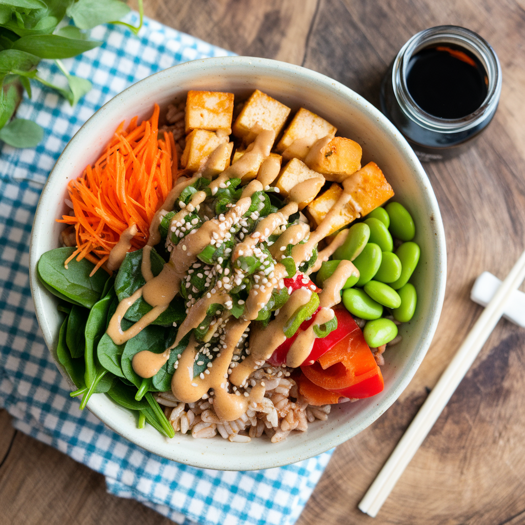 - Assemble the bowls: To assemble your Buddha bowls, start with a base of cooked brown rice or quinoa. Arrange the prepared vegetables—shredded carrot, sliced red bell pepper, and edamame—in separate sections over the rice. Add a handful of spinach or kale. Finally, top with the warm, crispy tofu.